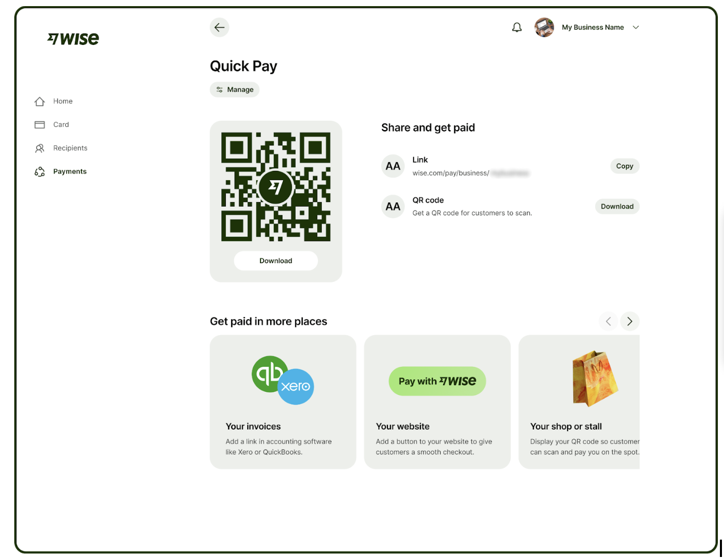 Wise helps you get paid faster, too. With Quick Pay, you can include QR codes and payment links to your invoices. And there’s integration with all your favourite invoicing and accounting tools like QuickBooks.