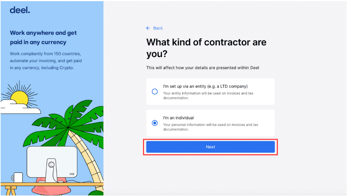 5.- Ahora deberás especificar que tipo de contratista eres. Si trabajas de forma individual, selecciona “I’m an individual”. Si operas asociado a una entidad debes elegir “I’m set up via an entity”.
