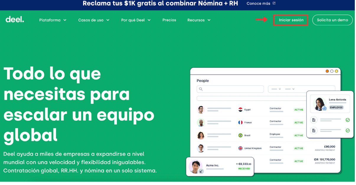 1.- Ingresa al sitio web de Deel y selecciona Iniciar Sesión.