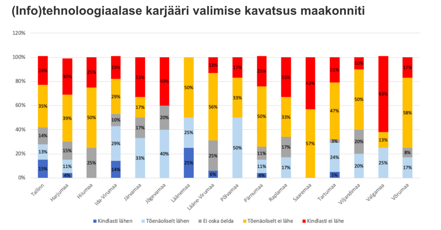 Maakondade lõikes on näha tugevat IT-huvi Ida-Viru noorte seas. Pea iga teine ehk 43% Ida-Viru noortest soovib mõnd (info)tehnoloogiaga seotud eriala õppida ning sama protsent, 43% tulevikus ka mõnes tehnoloogiaettevõttes või startup'is töötada.