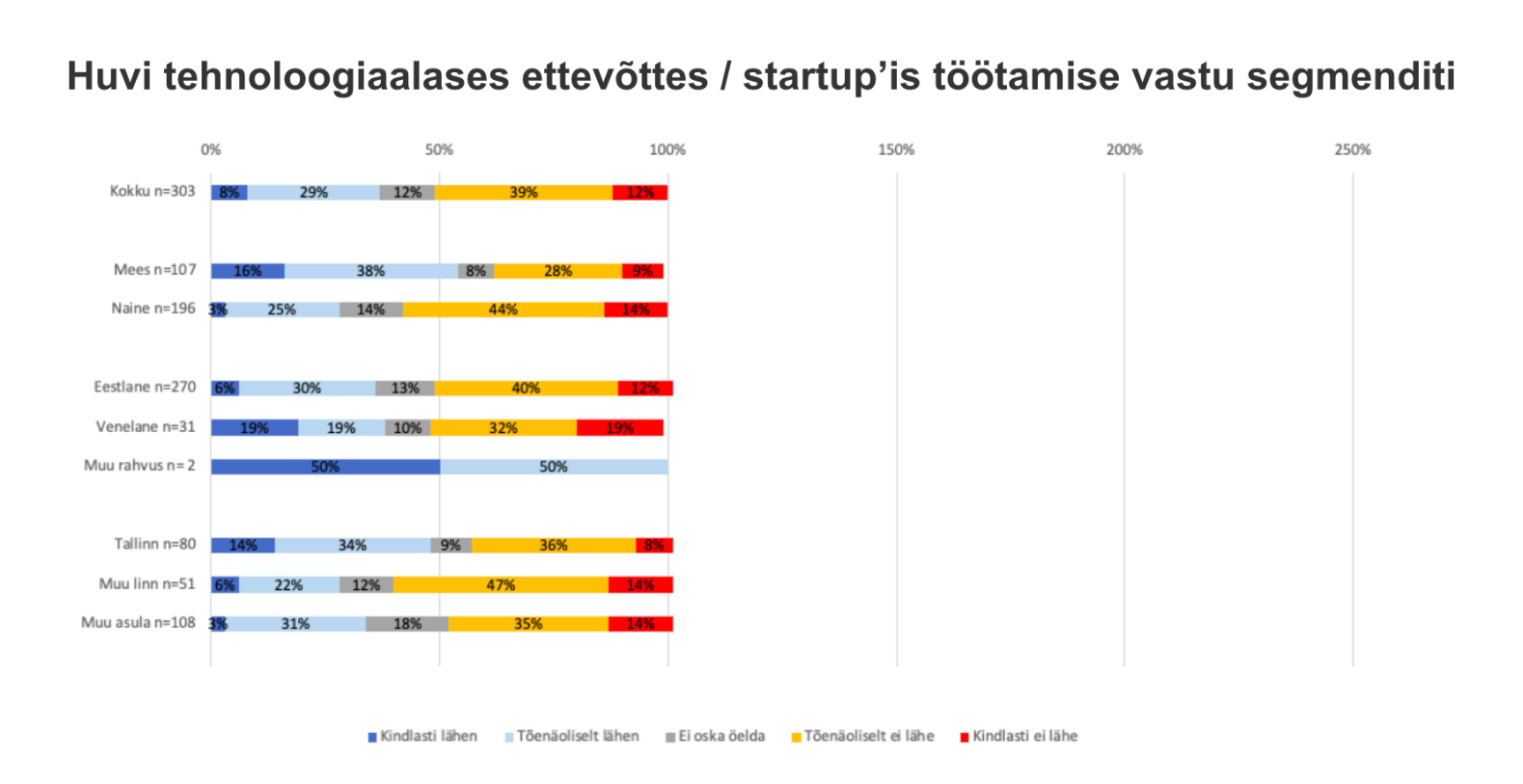 Enim soovivad seda Tallinnas (48%) ning suurlinnades (Tartu, Pärnu, Narva, Kohtla-Järve) elavad noored (37%). Väikelinnades (28%) ning maapiirkondades (33%) jääb protsent madalamaks. Töö idu- või tehnoloogiafirmas tõmbab eelkõige noormehi, kellest 54% tahab seda kindlalt või tõenäoliselt. Tüdrukute seas on see näitaja 28%.