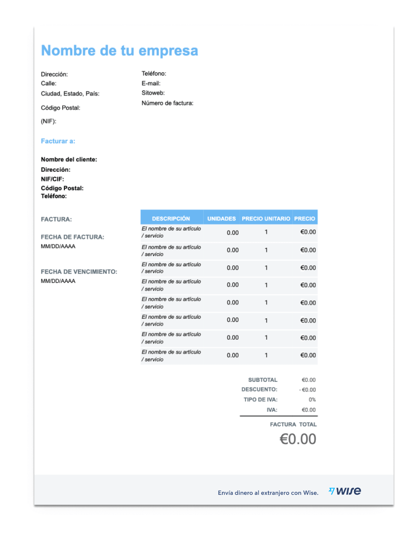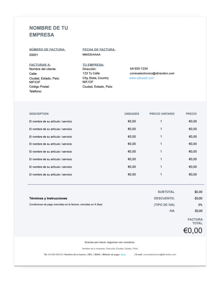 Utiliza nuestra plantilla de factura en blanco para comenzar tu facturación de forma rápida y sencilla. ¡Rellena toda la información de tu empresa y listo!
