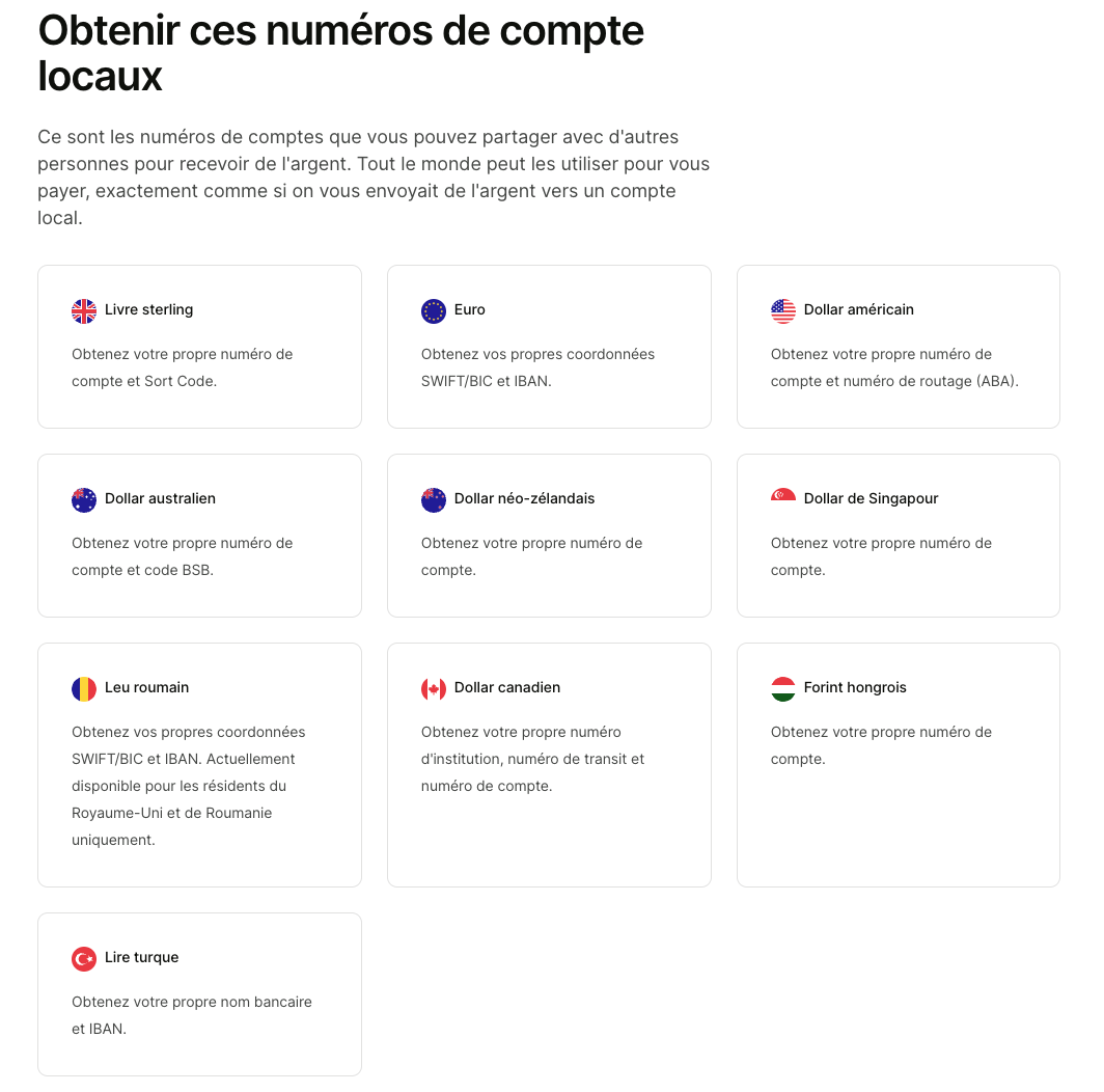 Les détails de compte locaux sont cruciaux pour notre entreprise, notamment en France, où nous proposons des comptes bancaires internationaux sans frais mensuels. Cela garantit l'accessibilité pour nos clients français, la conformité régionale, la personnalisation des services et renforce la confiance client.