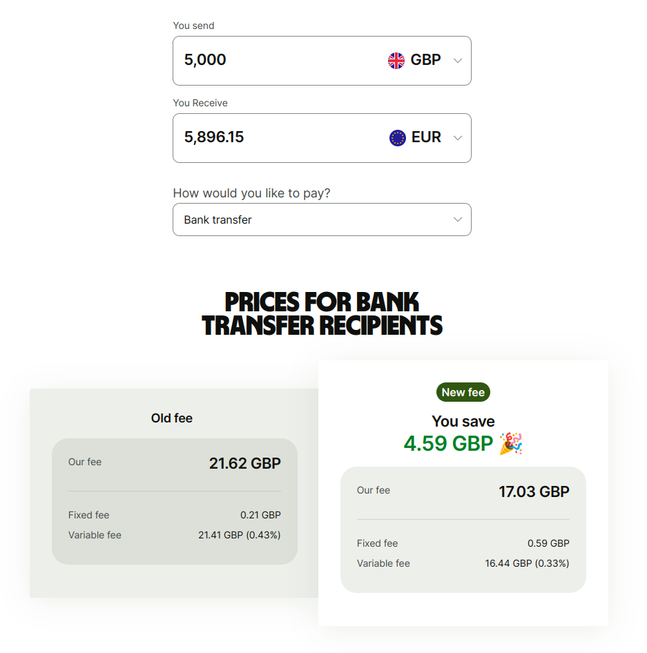 For example, sending GBP to MXN used to cost £0.31 + 0.55%. This is now £0.68 + 0.60%. This means the fee for a GBP 5000 transfer to Mexico is now 10% more expensive than before, but still cheaper and faster than most providers.