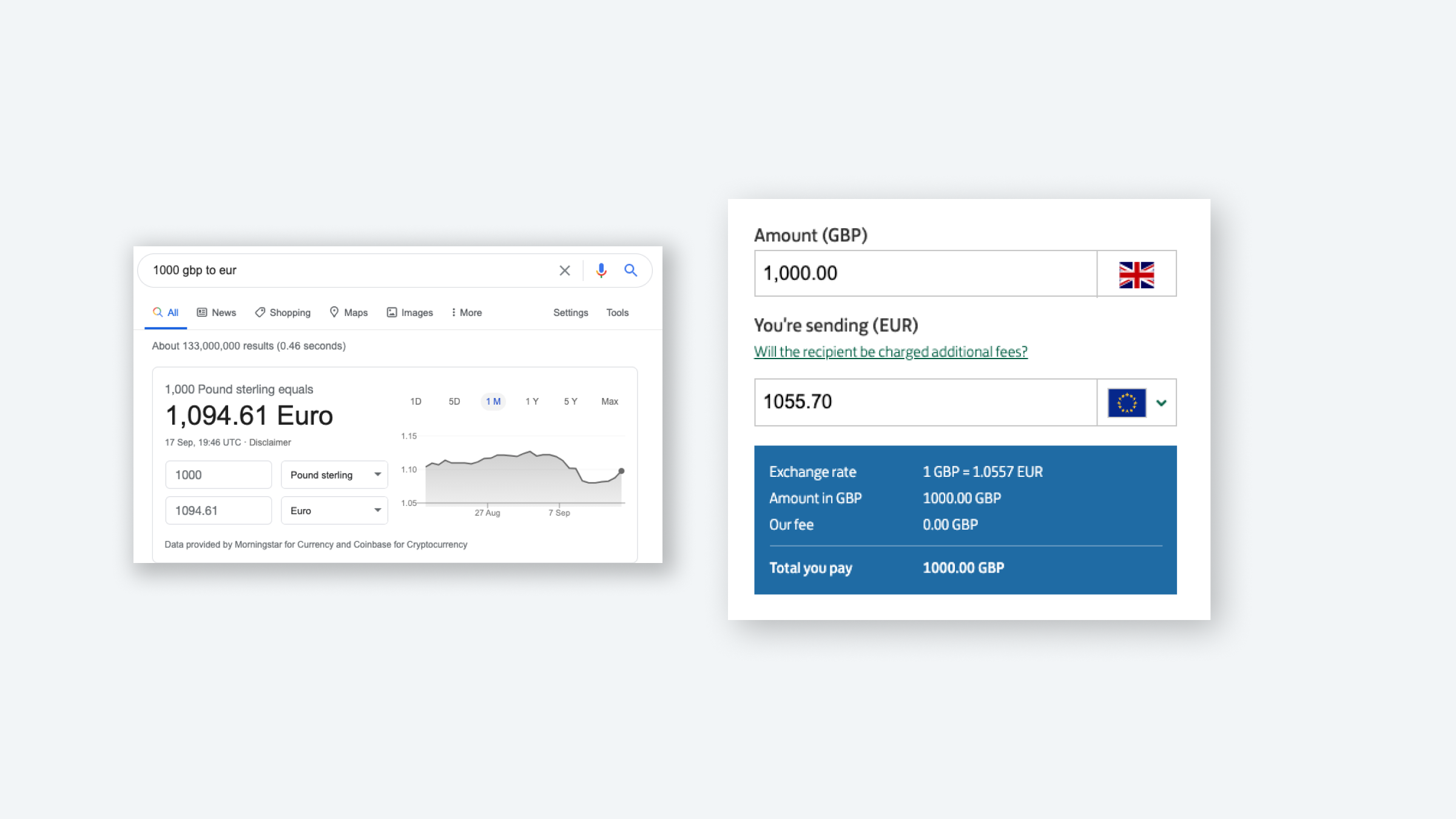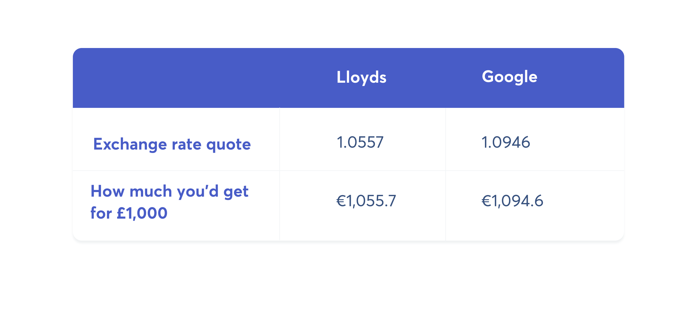 To your right: the quote of how much you’d get for your £1000 in €. To your left: how much you’d get according to Google. In this case, Lloyds states that the exchange rate is 1.0557. Google says it’s 1.094.