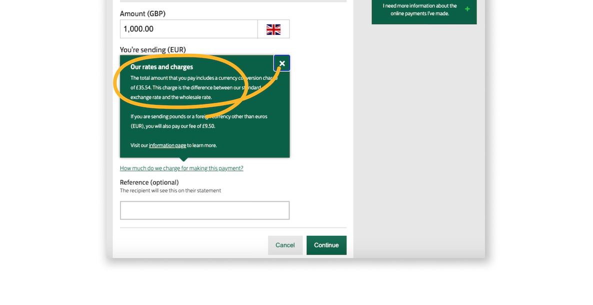 Click on it, and a green box pops up –– a tool tip which reveals the total amount paid includes “a currency conversion charge of £35.54”. Which they say is “the difference between our standard exchange rate and the wholesale rate”.
