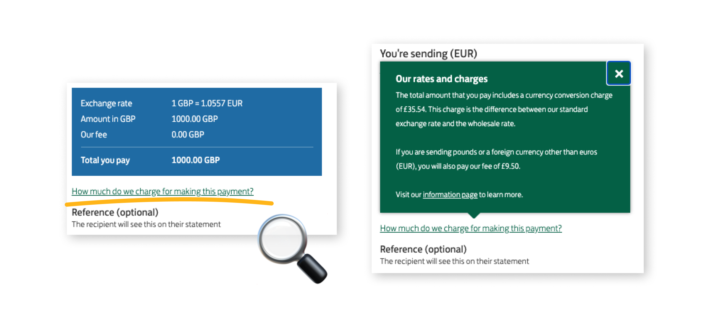 You’d need to be eagle eyed, but under the blue table in the image below you can see in tiny small print “How much do we charge for making this payment”.