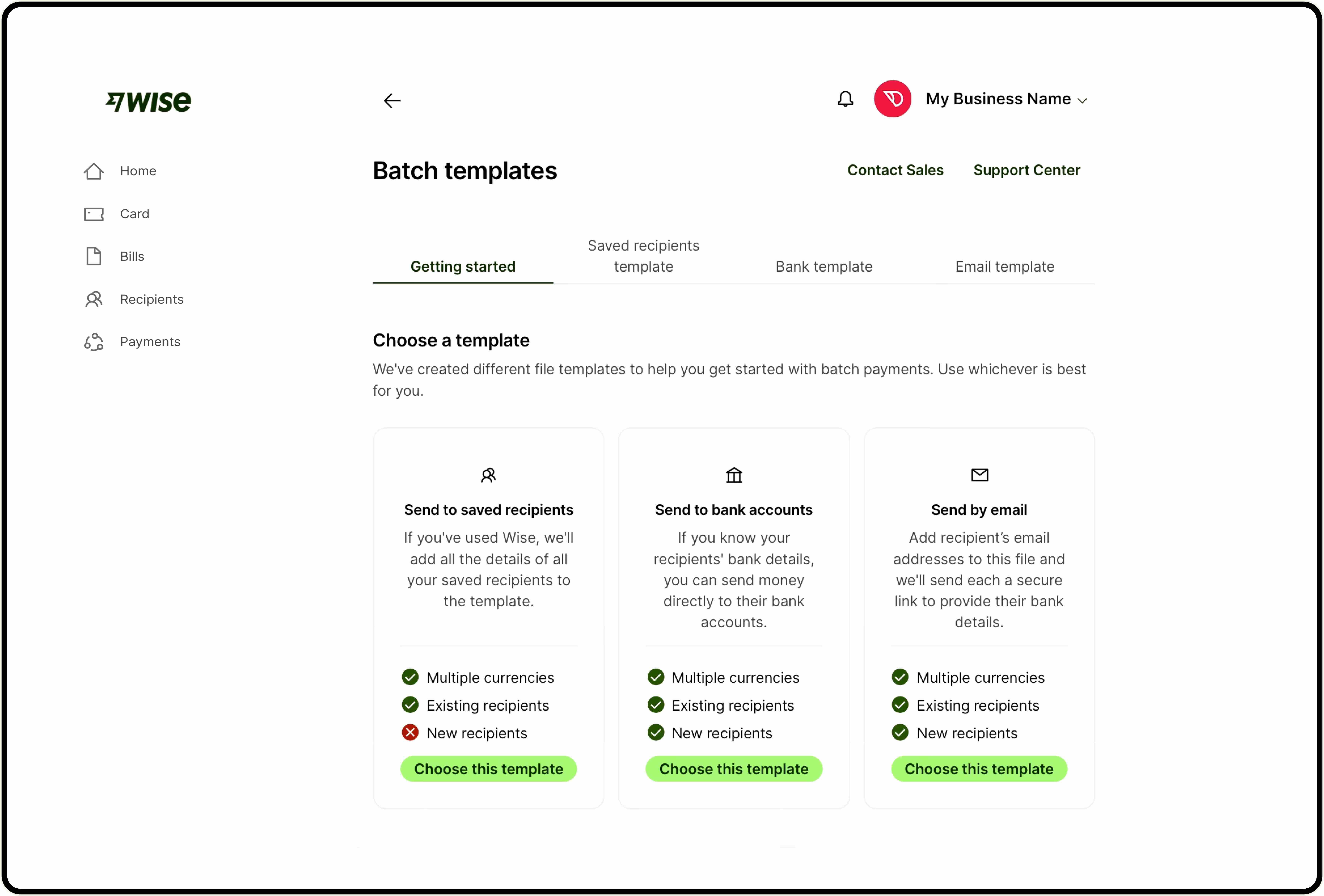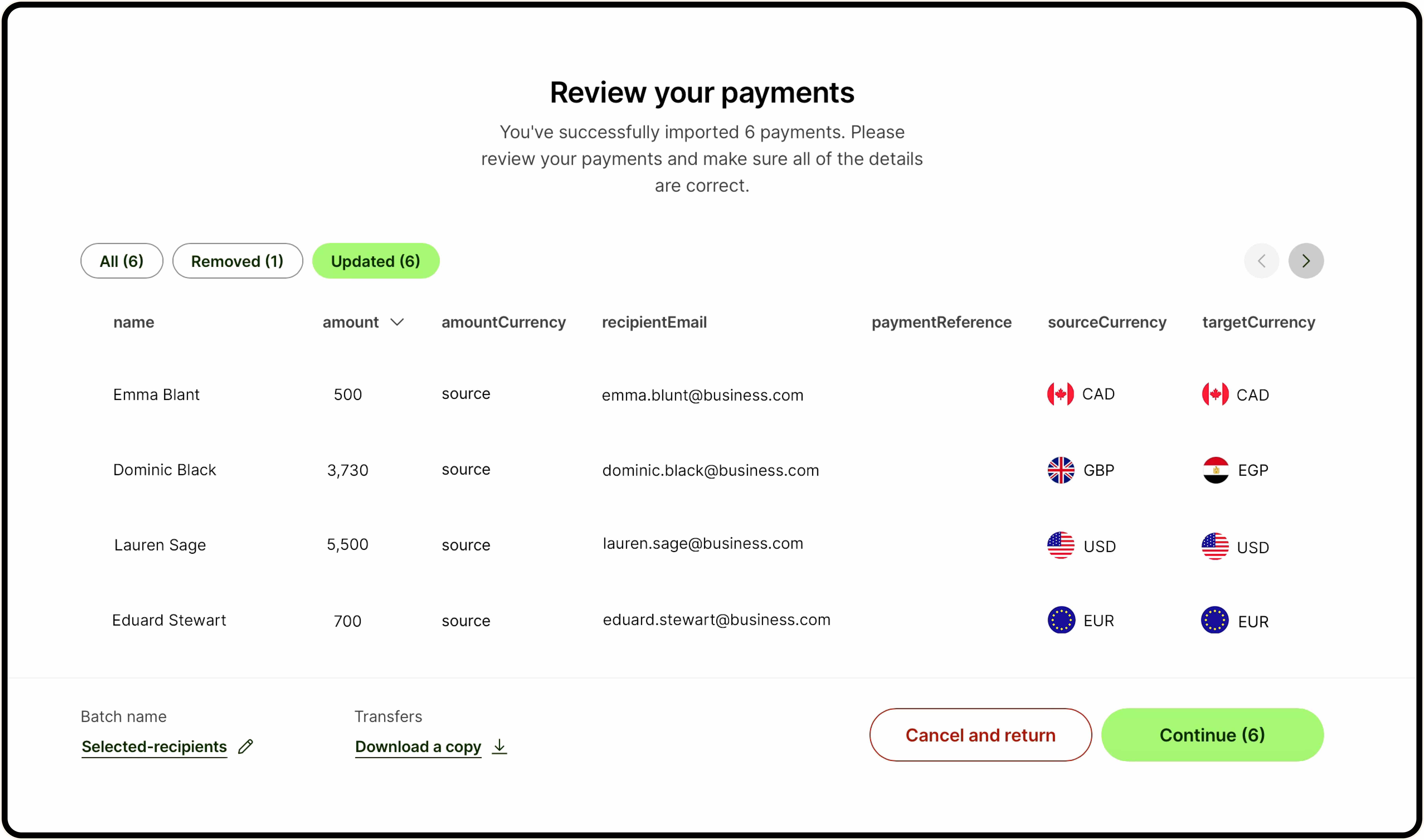 Batch payments let you create and send multiple payments in one go. You are able to fix the errors you encounter on batch payments on the website after uploading your payments to give you more flexibility in setting up large payments.