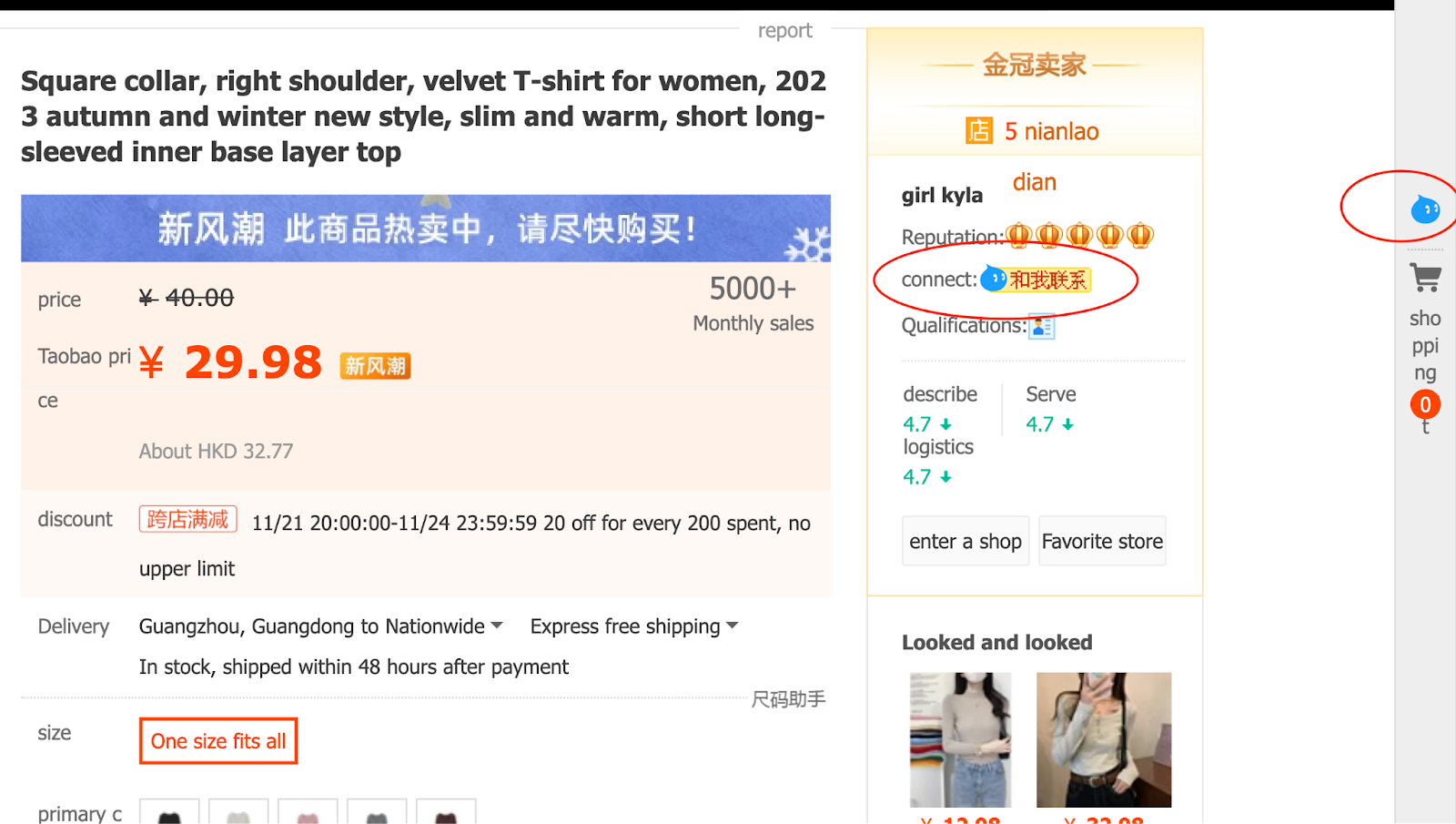 Often when you want to order customised goods or are unsure about which size of T-shirt to choose, talking to the seller to confirm the details can be a great help! This way, you can ensure you get your items exactly as you want them. You can contact the sellers by clicking on the Aliwangwang (阿里旺旺) button next to the connect information, or you can find this button in the right-sided bar.