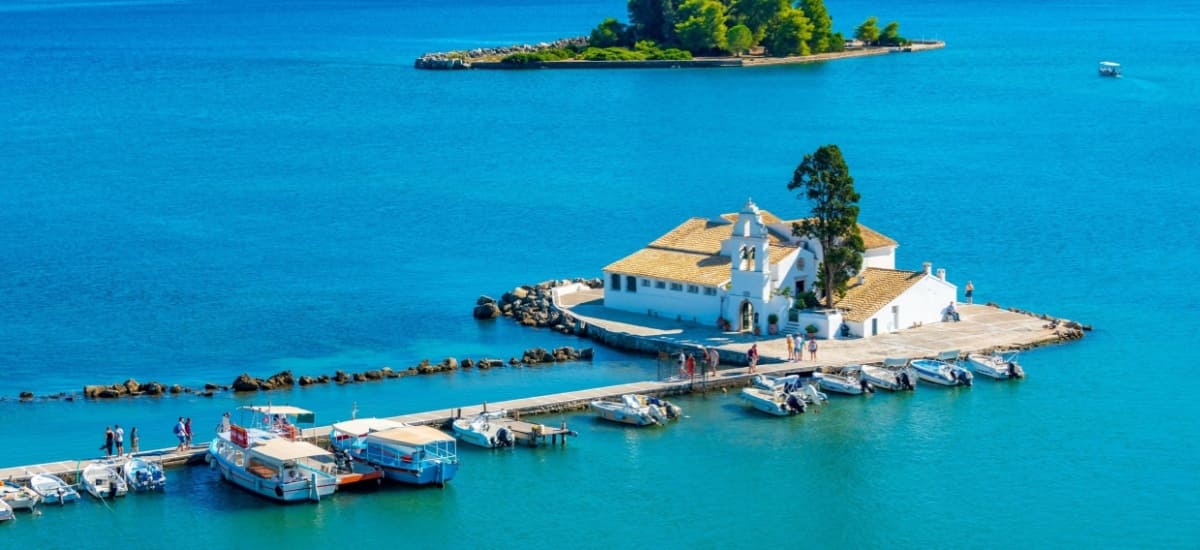 A Vlacherna kolostor Korfu egyik legismertebb fotótémája. Egy apró szigeten áll, ahová egy hosszú mólón sétálhatsz el. Egyszerű, fehérre meszelt épületével és a körülötte lévő tengerrel varázslatos látványt nyújt. A közeli repülőtér miatt időnként felszálló gépek szelik át az eget, ami még különlegesebbé teszi az élményt. Ha szeretnél egy ikonikus korfui helyszínt megörökíteni, a Vlacherna kolostor kihagyhatatlan.