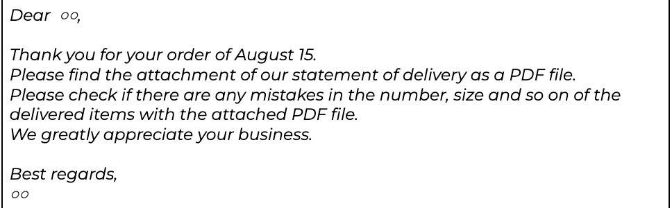 納品書を作成したら、英文のメールで送信します。その際は以下のような文面を参考にしてみても良いかもしれません。