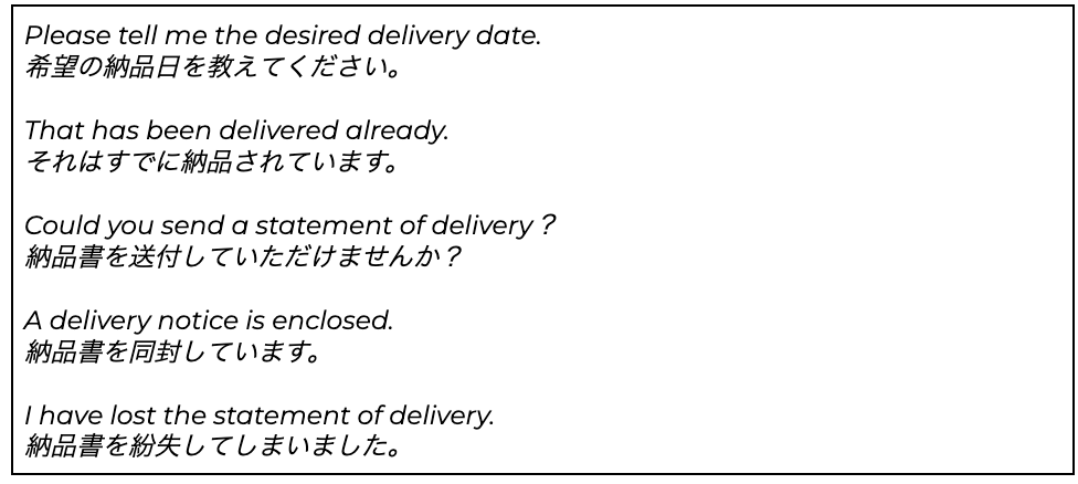 また、以下の英語表現を覚えておくと、納品や納品書に関するやりとりをする際に便利かもしれません。