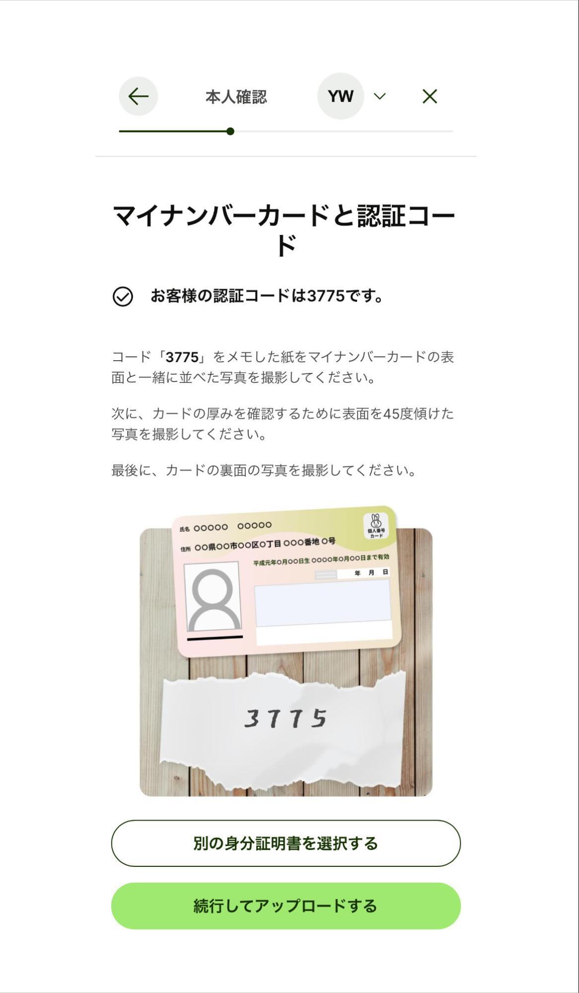 画面に表示される4桁の認証コードを紙に書きましょう。そして、その紙と身分証明書を一緒に並べて撮影してください。4桁の認証コードが発行されてから30分以内に身分証明書やセルフィーの写真を提出してください。