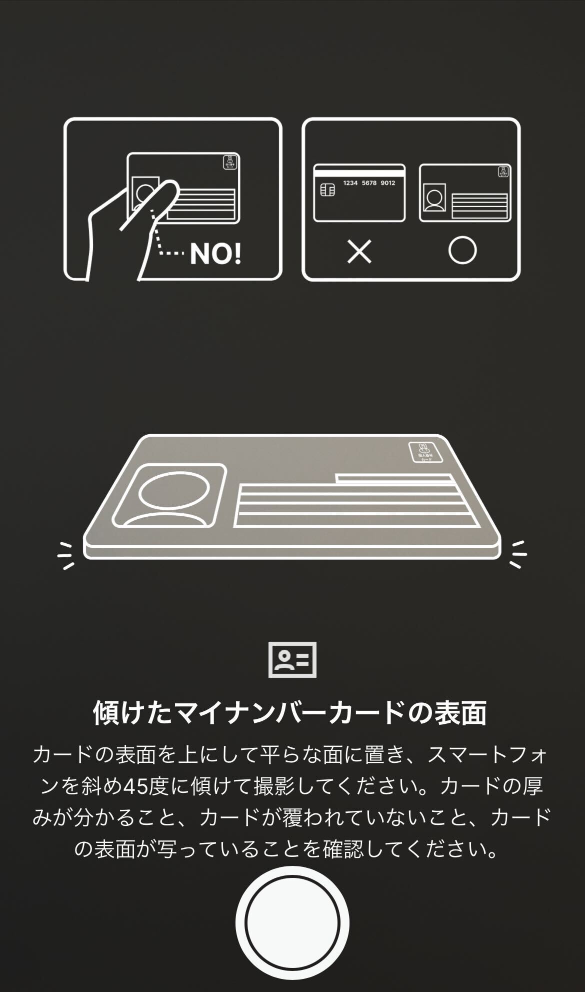 次に、身分証明書の厚みを確認するために、身分証明書を45度ほど傾けて撮影してください。その際、表面の情報が写っているかどうかも確認してください。この段階では、認証コードを撮影する必要はありません。