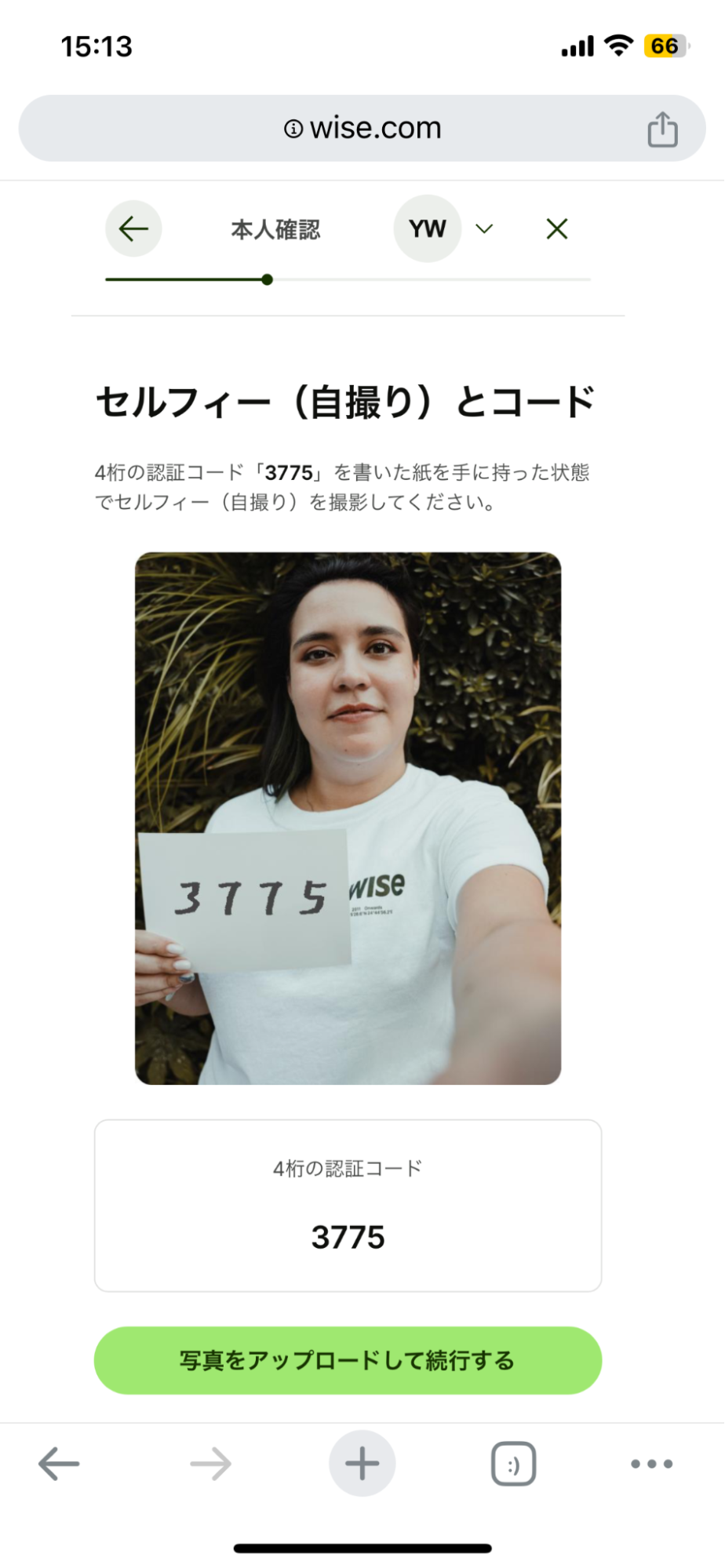 先ほど書いた4桁の認証コードを記載した紙を正面に向けて持ち、セルフィー(自撮り)を撮影してください。