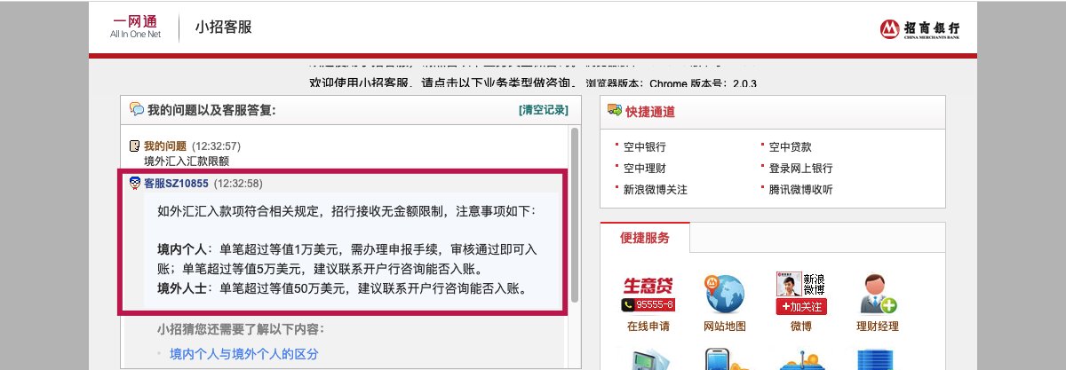 如外汇汇入款项符合相关规定,招行接收无金额限制,注意事项如下: